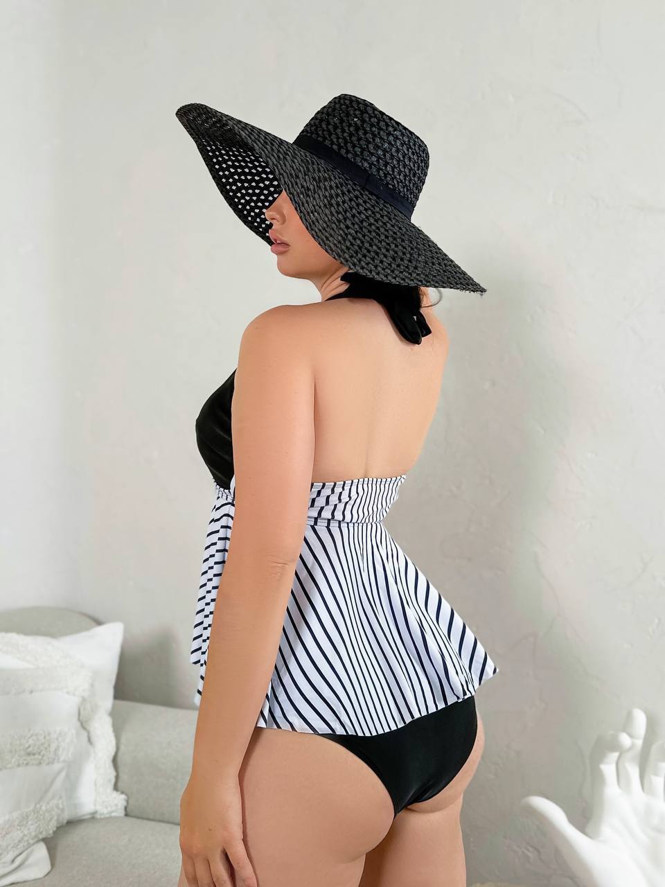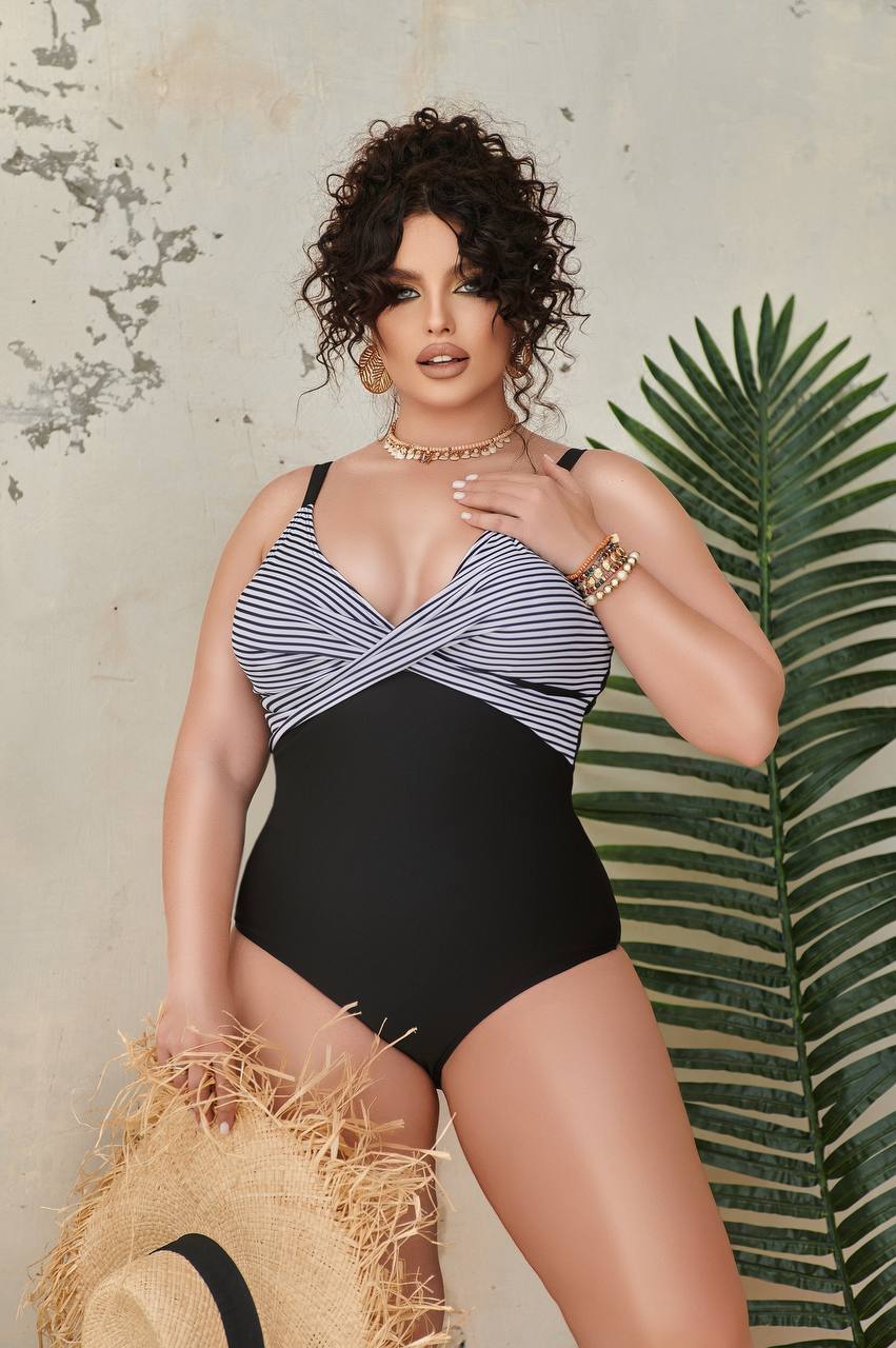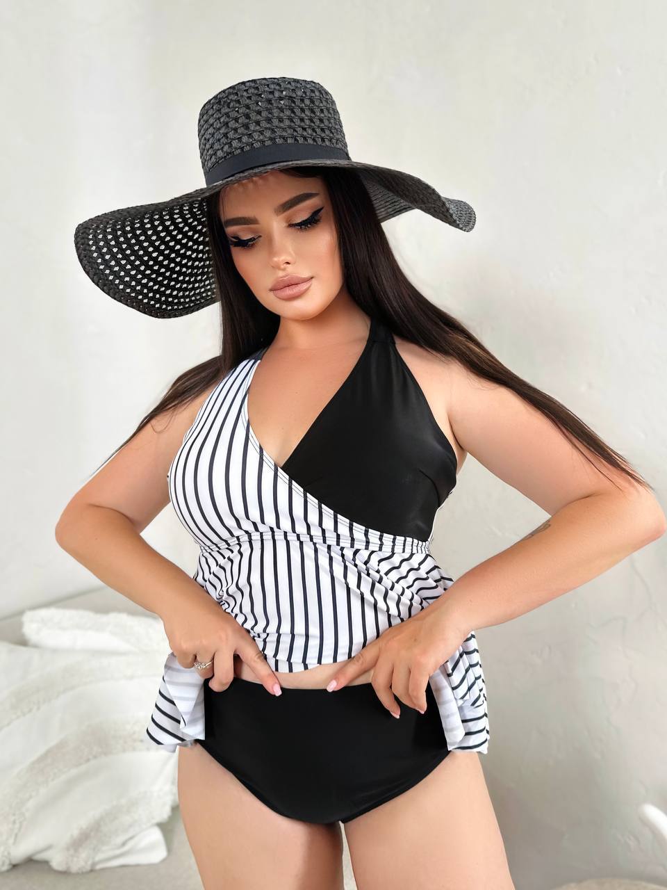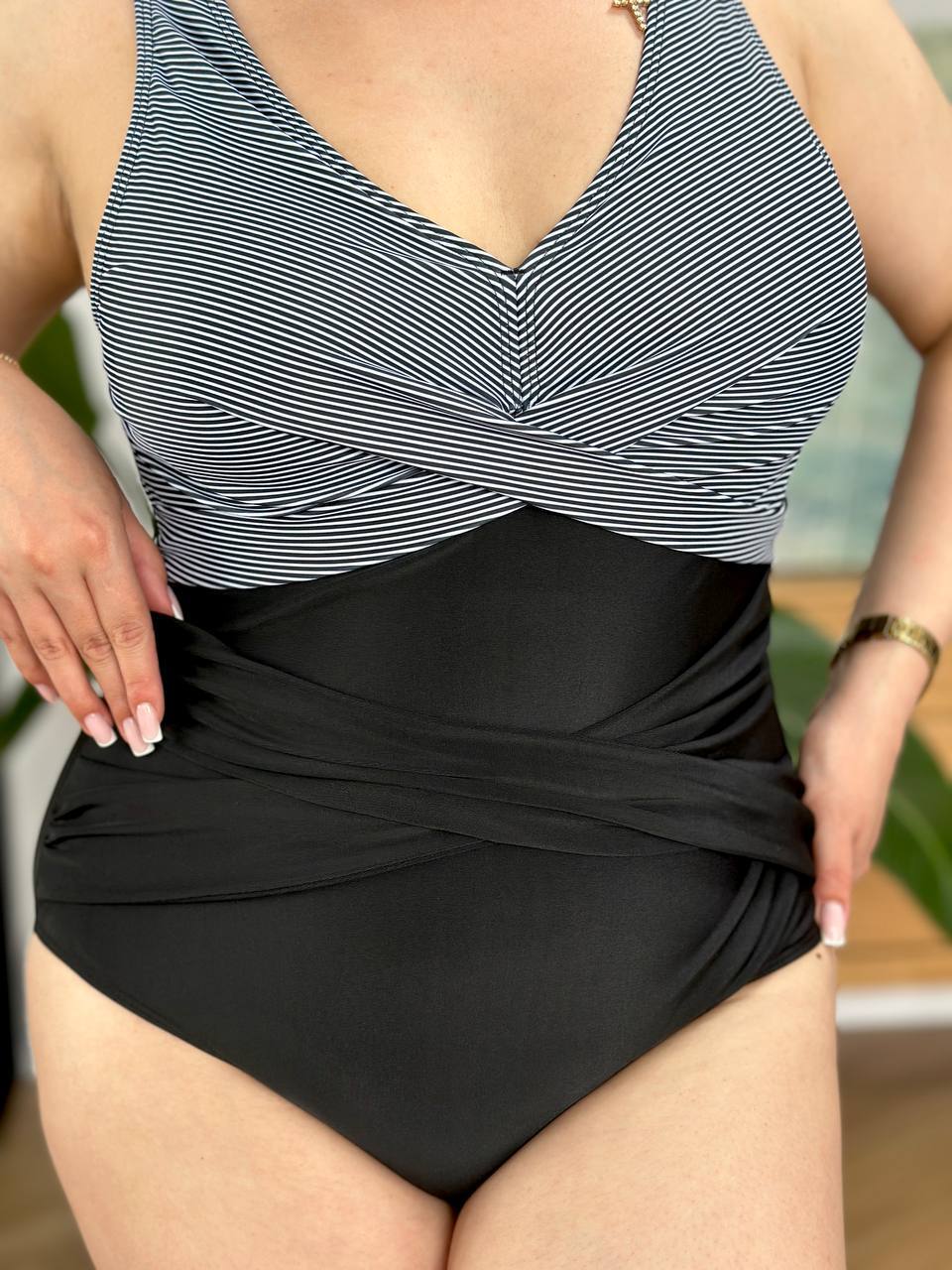🤍Верх у класичну смужку візуально підкреслює лінію грудей і витягує силует, а чорні плавки із завищеною талією та декоративними складками м’яко моделюють фігуру, роблячи її більш стрункою та витонченою🥰