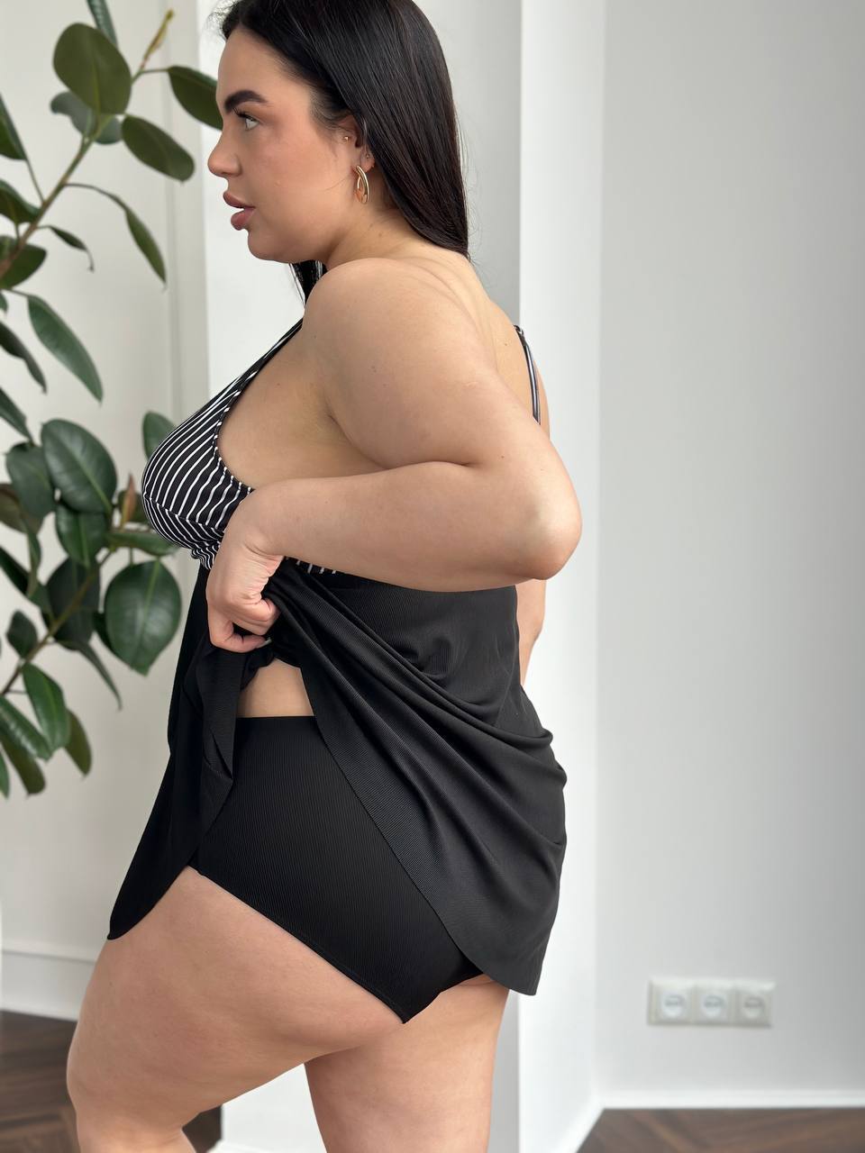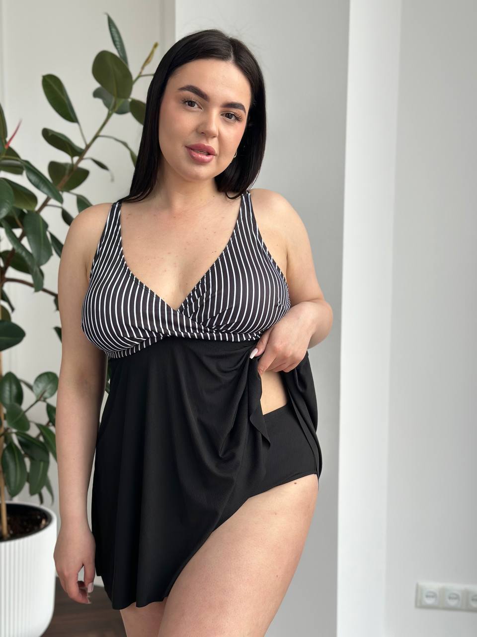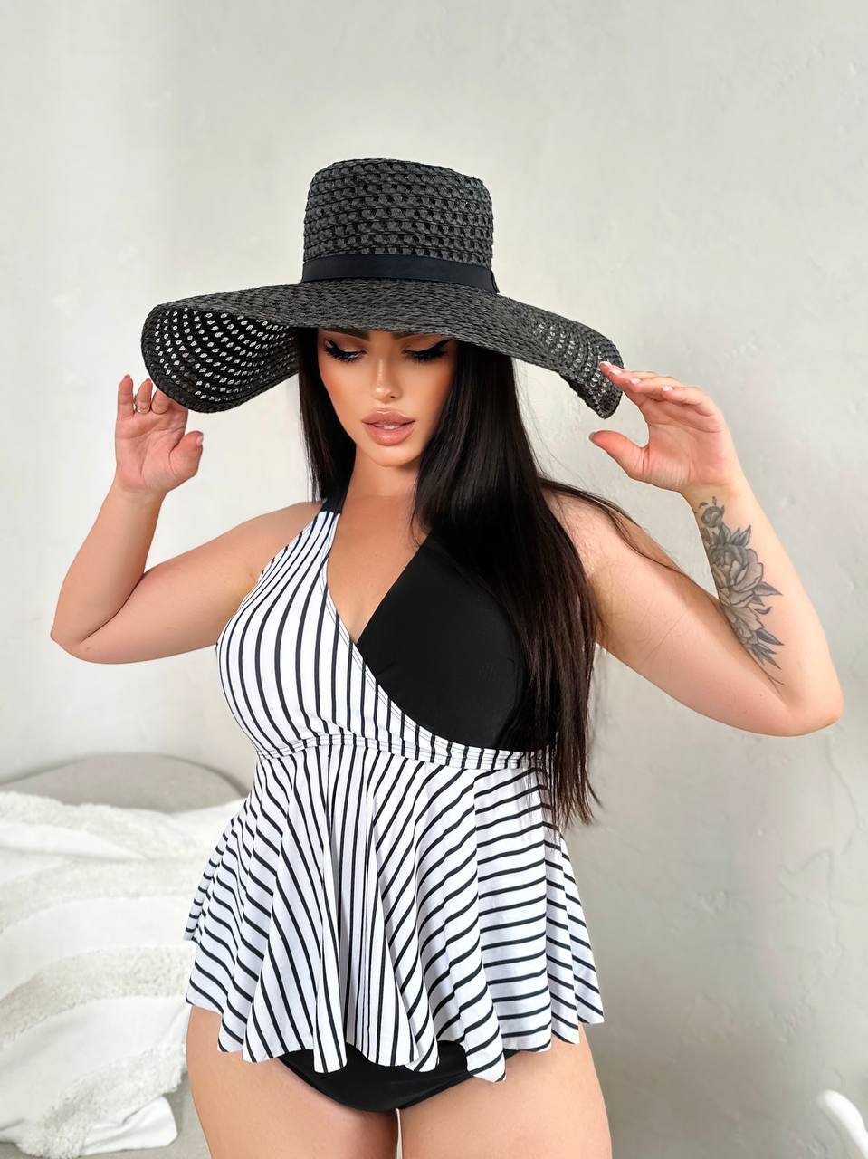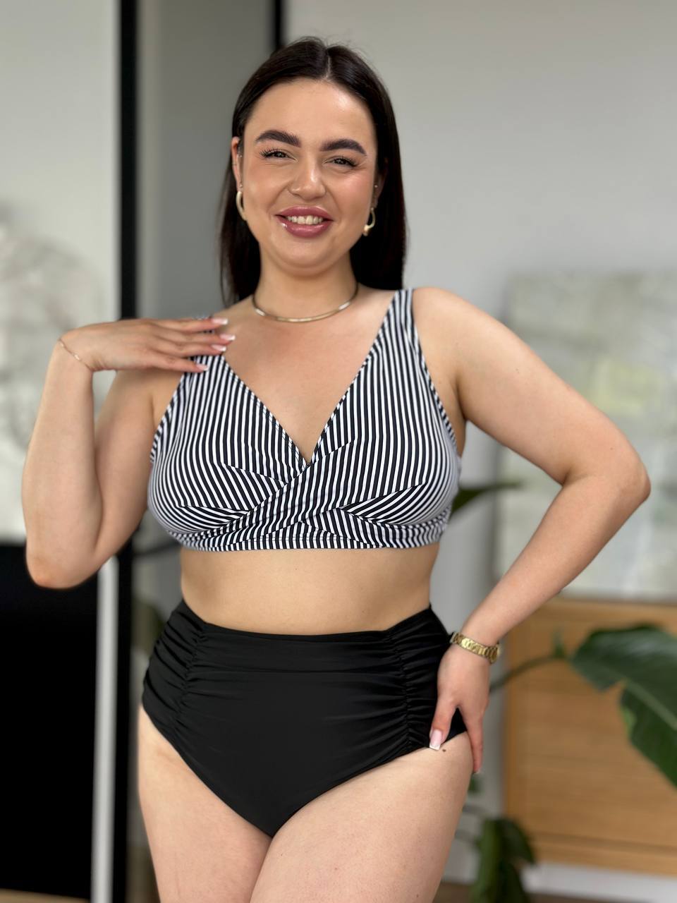 🤍Верх у класичну смужку візуально підкреслює лінію грудей і витягує силует, а чорні плавки із завищеною талією та декоративними складками м’яко моделюють фігуру, роблячи її більш стрункою та витонченою🥰