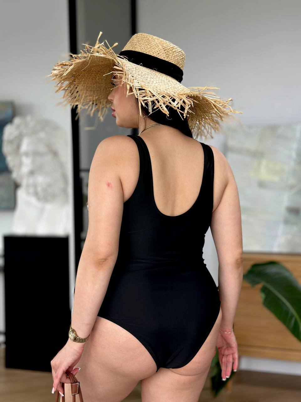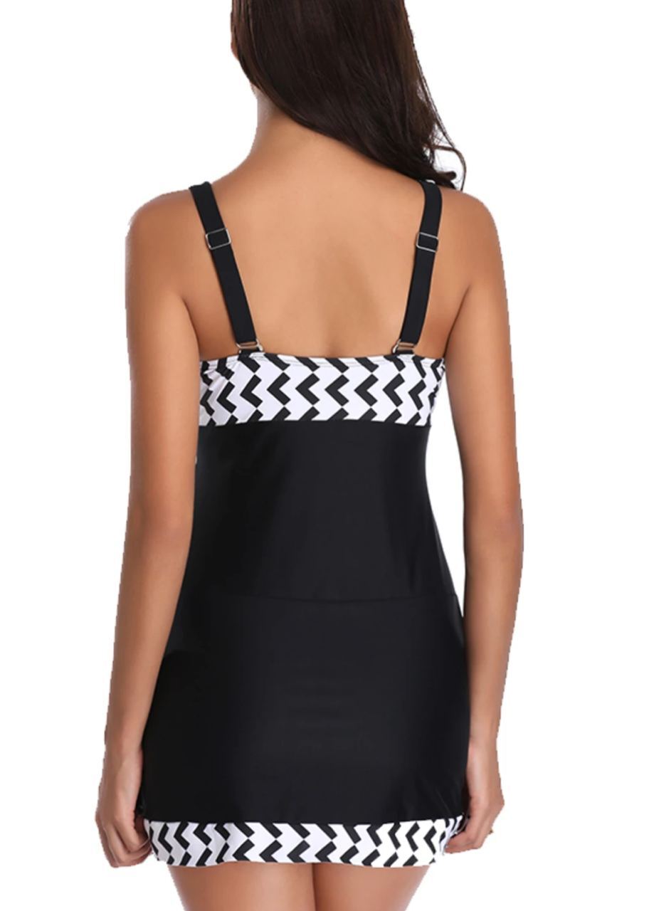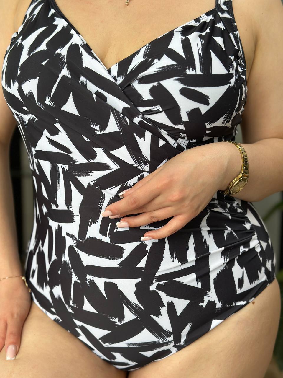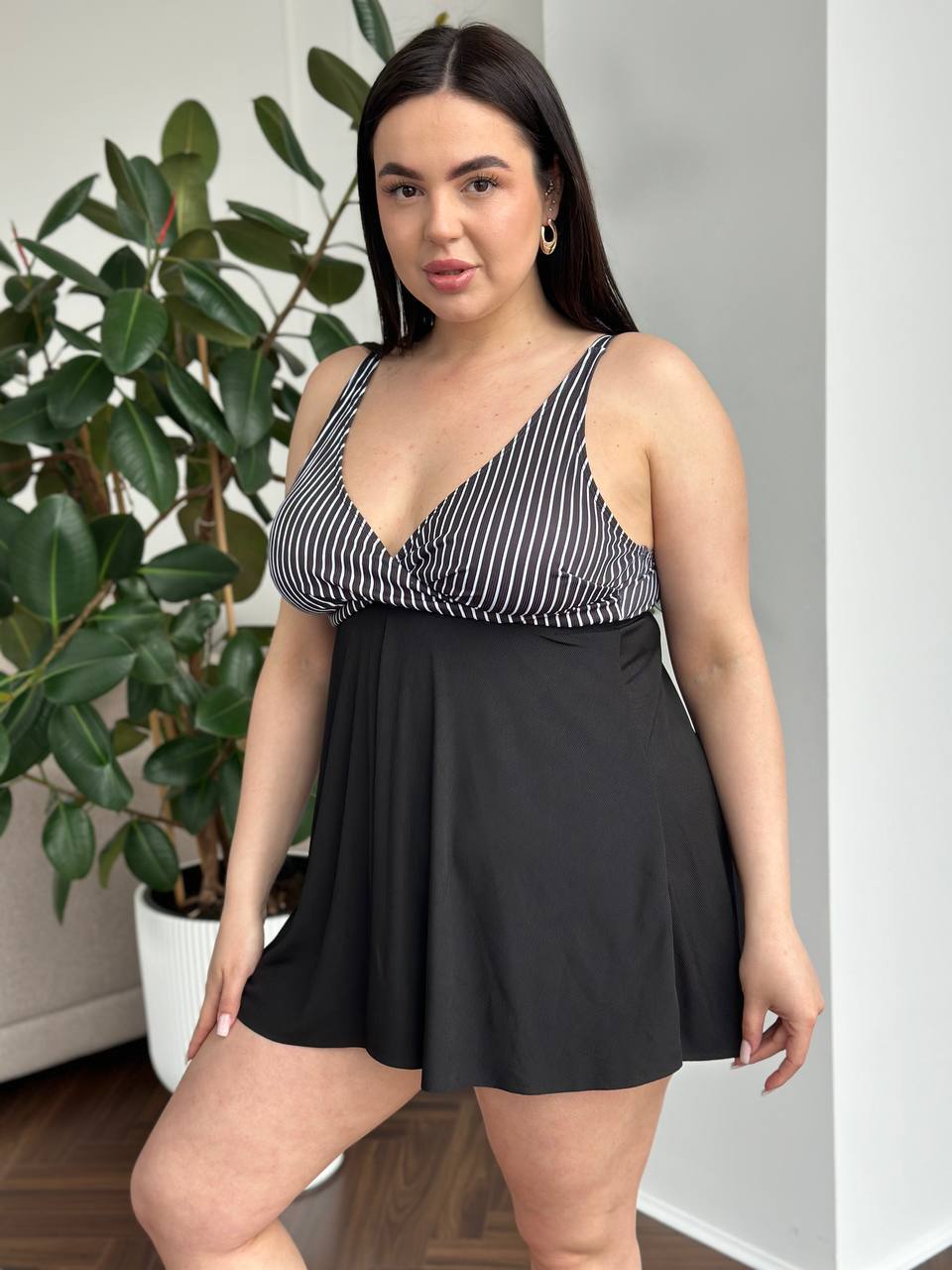 🤍Верх у класичну смужку візуально підкреслює лінію грудей і витягує силует, а чорні плавки із завищеною талією та декоративними складками м’яко моделюють фігуру, роблячи її більш стрункою та витонченою🥰