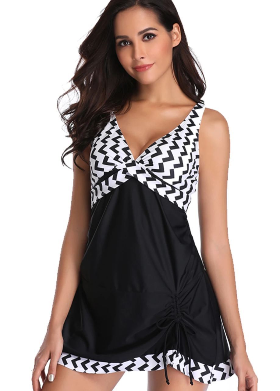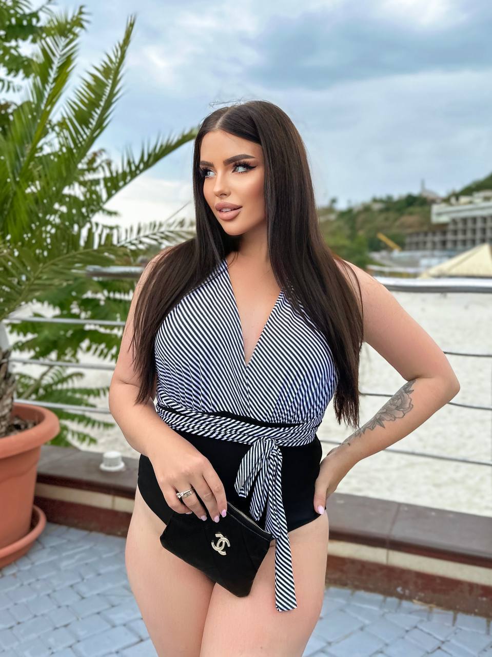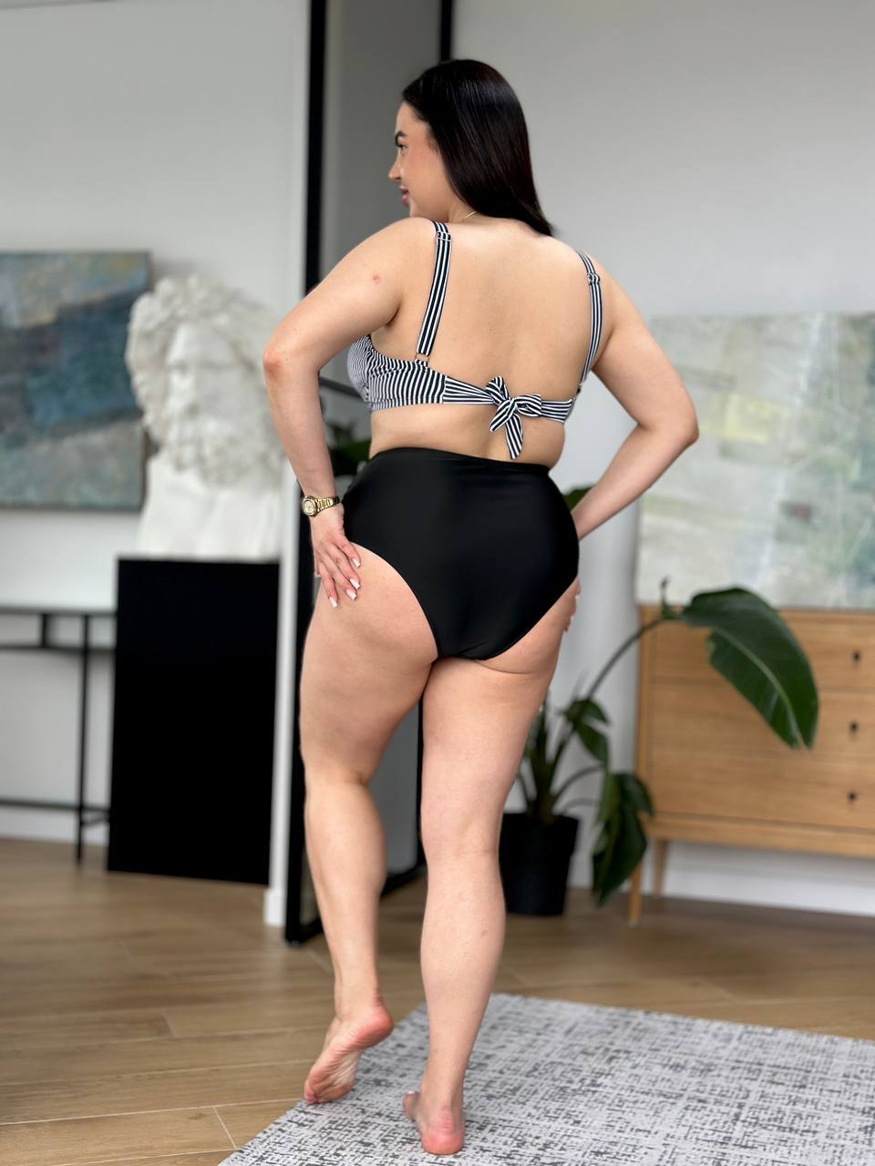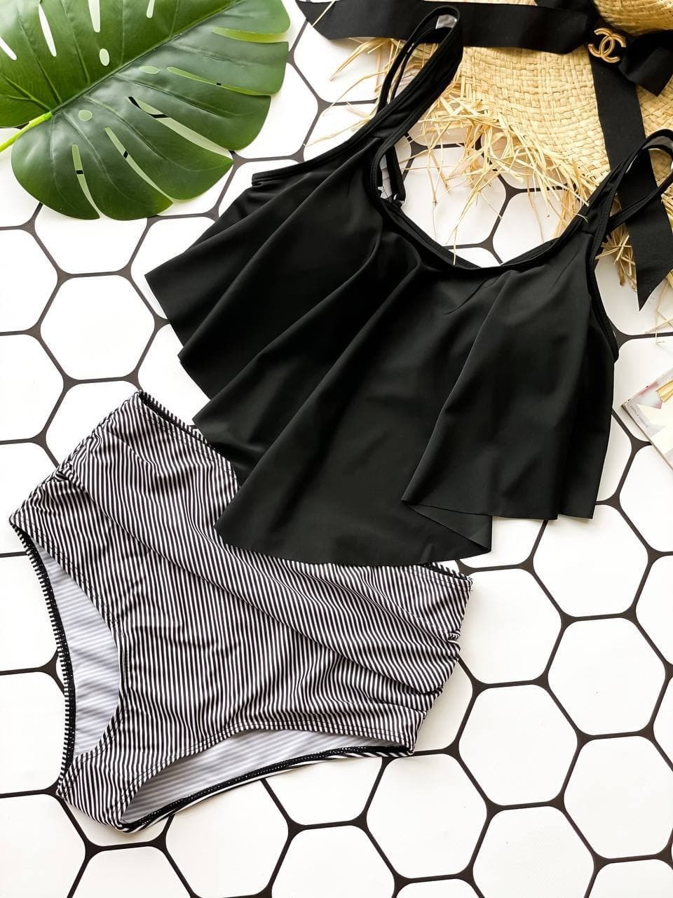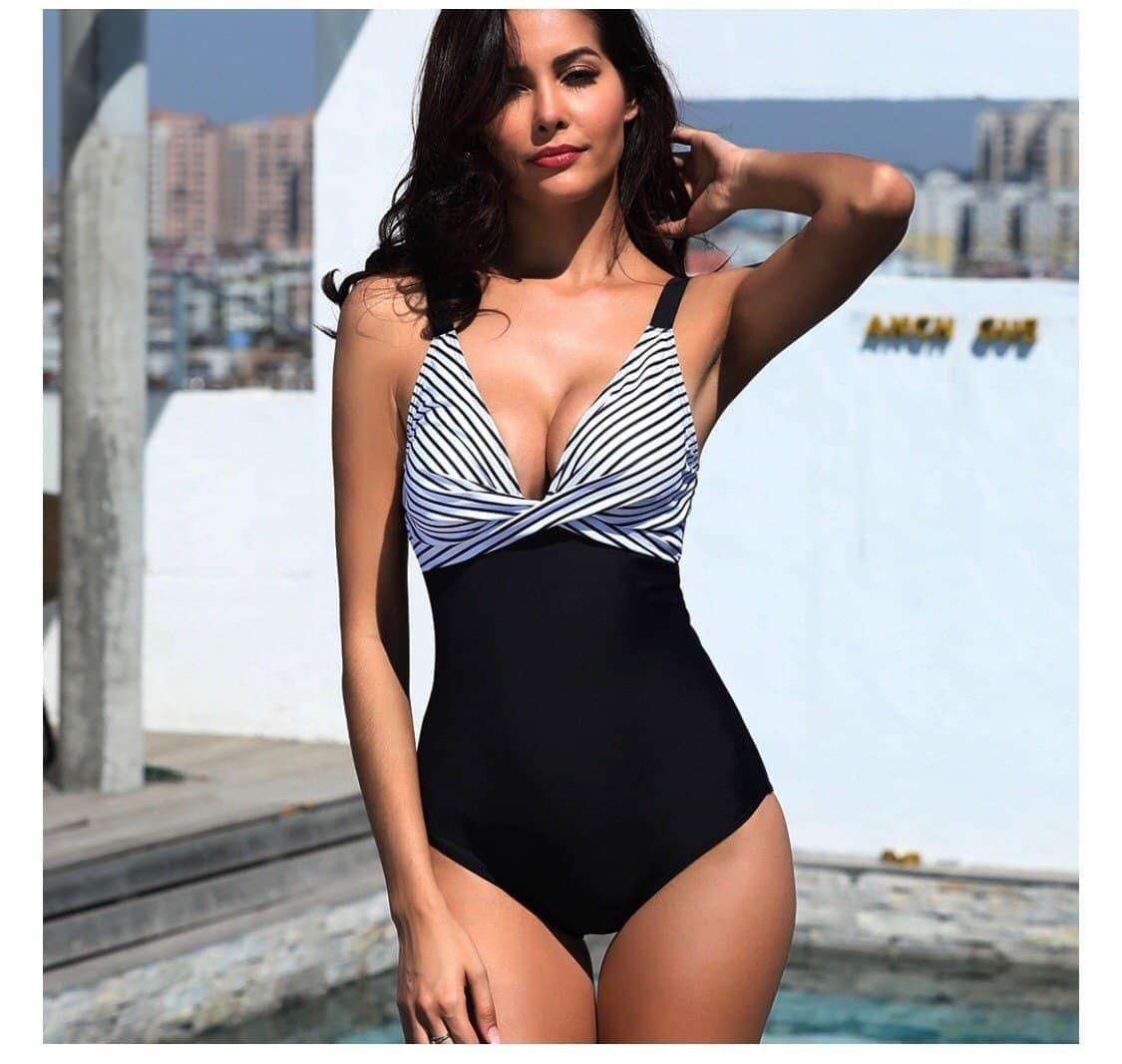 🤍Верх у класичну смужку візуально підкреслює лінію грудей і витягує силует, а чорні плавки із завищеною талією та декоративними складками м’яко моделюють фігуру, роблячи її більш стрункою та витонченою🥰